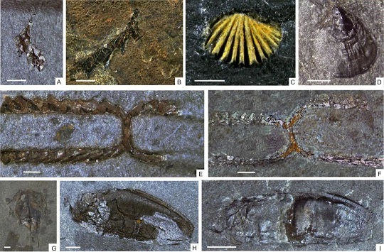 A: Paratemnograptus sp.; B: Tetragraptus sp.; C: Tritoechia sp.;D: Lingulella sp.; E, F: Tetragraptus approximatus Nicholson; G, H, I: Phyllocarida. 比例尺=1mm