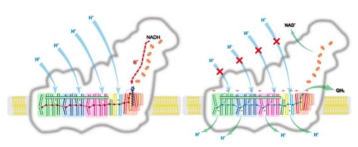 下面,我们以复合物I为例简单介绍呼吸复合物是如何通过电子传递耦联质子转运来实现能量的高效利用的。哺乳动物的复合物I是一个大型的蛋白质机器,总共包含45个蛋白亚基,整体上呈L形,由跨膜臂和亲水臂接合而成。复合物I的亲水臂朝向线粒体基质中,位于其头部的FMN分子可以结合线粒体基质中的NADH,并将NADH上的两个电子通过固定在亲水臂上的7个铁硫中心逐个传递给结合在亲水臂与跨膜臂交界处的辅酶Q上,使辅酶Q呈强电负性。复合物I的跨膜臂有4个由高度保守的跨膜螺旋包围形成的质子通道,每个质子通道周围都有两个跨膜螺旋在线粒体内膜的中部发生断裂并由一小段可弯曲的肽段连接起来,这样的结构使得质子通道的构象具有高度的可变性。同时,在跨膜区中,众多跨膜螺旋的中段含有高度保守的极性氨基酸(赖氨酸、精氨酸、谷氨酸),它们与固定在膜中部的水分子一起形成了一条极性的导线,直接从跨膜区的远端连接至亲水臂和跨膜臂交界处的辅酶Q结合位点,横跨整个跨膜区,将所有质子通道中部的电性都与复合物I所结合的辅酶Q的带电性结合起来。结合辅酶Q时,复合物I跨膜区质子通道开口朝向线粒体基质,在辅酶Q获得电子带电负性之后,跨膜区中部的极性导线整体呈电负性,从而吸引线粒体基质中丰富的带正电的质子进入跨膜区中部。随后,辅酶Q从中获得两个质子并从复合物I上脱离出去。辅酶Q的脱离使得跨膜区的质子通道发生构象变化,原本朝向线粒体基质的开口转而朝向线粒体膜间隙,而此时由于辅酶Q的离去原本膜中间呈电负性的导线恢复电中性,失去对质子的吸引能力。因而,从线粒体基质中吸引进入膜中部的质子被排出,进入线粒体膜间隙,复合物I也就此完成了一个传递电子并耦联质子转运的循环(图3)。