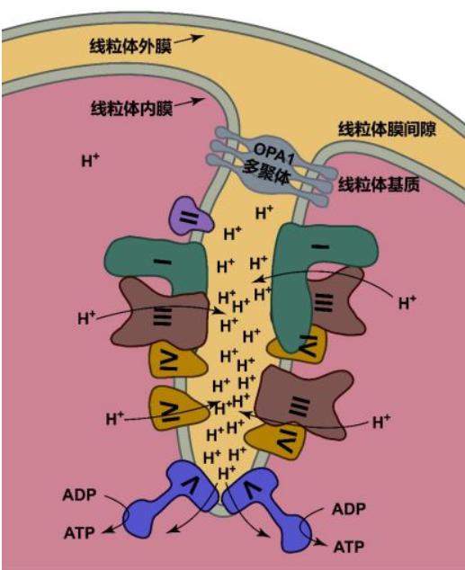 我们的故事从线粒体开始讲起。线粒体是细胞内由双层膜包被的大型细胞器,是细胞内的能量工厂,呼吸作用发生的主要场所,其直径大约为0.5~1微米。除呼吸作用外,线粒体还参与了一系列重要的生命活动,包括糖类和脂质的代谢、细胞凋亡、衰老以及钙离子稳态的调节等。线粒体外膜通透性较高,结构较为简单。线粒体内膜组成成分则较为复杂,含有丰富的蛋白质和心磷脂以及少量的胆固醇,且可以向内折叠形成嵴,其上分布着大量进行细胞呼吸的蛋白质复合物。嵴的存在极大地扩展了线粒体内膜的表面积,增加了呼吸作用进行的空间(图1)。