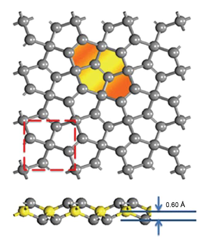 通过计算模拟设计了一种仅由五边形构成的准二维亚稳碳结构——五边形石墨烯。这一结构具有非常独特的几何构型(图1),在平衡状态下的厚度仅为1.2 Å,其平面投影类似于上述报道中实现二维镶嵌的第8种用五边形不重叠无缝隙的密排图案。与石墨烯仅由sp2杂化的原子构成不同,该结构的每个单胞中含有2个sp3杂化的碳原子和4个sp2杂化的碳原子,且碳碳单键和双键并存,碳原子不再完全化学等价。虽然总能量计算表明该结构是碳的一种亚稳相,而声子谱计算和分子动力学模拟则确定了其动力学稳定性和热稳定性,并且发现它可以承受1000 K的高温。