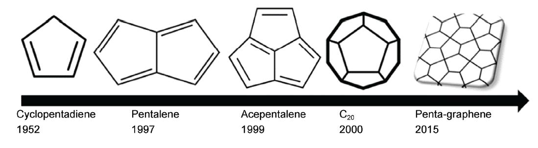 与其他碳材料的结构相比,五边形石墨烯最显著的特征是其结构单元仅为五元碳环。在碳材料家族中,五元碳环和六元碳环是基本的结构单元,如富勒烯分子C60是由12个五边形和20个六边形构成的,其中任意2个五边形之间都会被六边形隔开,这是由于碳五元环的聚合会导致结构产生较大的内应力,故而倾向于相互分离,其他更大的富勒烯分子中亦发现了类似现象,这一规律被总结为“孤立五边形规则”(isolated pentagon rule,IPR)。但是,五边形碳环的聚合并非不可能,2000年,Nature报道了实验上合成仅由五边形构成的最小的富勒烯分子C20,其笼状构型类似于正五边形构成的正十二面体。尽管该构型并不是C20分子的热力学最稳定构型,但是质谱显示此笼状结构可与热力学更为稳定的环状、碗状等构型并存,这表明IPR规则是可以被打破的。事实上,早在1997和1999年,人们就已经合成出了由2个和3个碳五元环构成的并环戊二烯(pentalene)和三环反芳香性的环戊[c,d]戊搭烯(ace- pentalene)。这些结构单元为实验上采用自下而上(bottom-up)的方法制备五边形石墨烯提供了可能性(图 2)。此外,在材料化学中,五边形同样具有重要的地位,许多由其他元素所构成五元环分子也显示非常诱人的性质,为设计和合成其他类五边形石墨烯结构提供了化学基础。