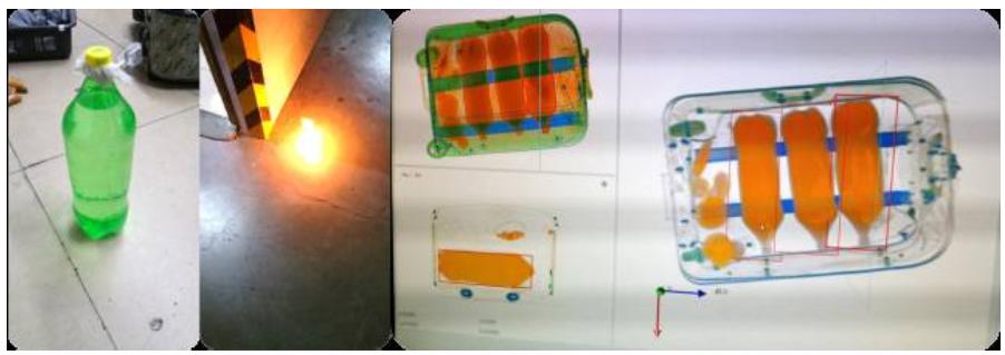 我们的X射线安检设备对这三个雪碧瓶子自动标上了有机物特有的橙色。从包里拿出来的时候,现场的安检员和你想法一样,就是“雪碧”嘛。可开盖以后发现一点就着,最后证明是被人偷换成了违禁品“甲醛”。