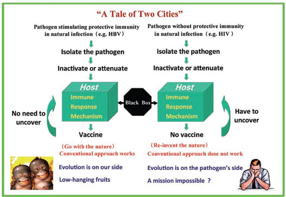 借用狄更斯的《双城记》, 将疫苗分为两类(图1), A类是针对自然感染可以诱导宿主产生保护性免疫的病原体, 研制疫苗只需找出对应的病原, 按传统工艺对之灭活或减毒, 接种人体就能达到预防该类疾病的目的。这是因为人体免疫力在进化上就强于这类病原。例如, 感染乙肝和甲肝病毒时, 多数人可清除病毒, 体内有抗体却没有病毒。少部分未清除病毒的感染者多可控制病毒成为健康携带者。而作为B类病原体的HIV感染人体时, 免疫系统既不能清除也无法长期控制病毒, 不存在有抗体没病毒的状况, 如不治疗大多会发病死亡。研究A类疾病疫苗是低枝易摘果实, 而B类病原疫苗则是难上加难, 因为自然进化的力量在病原体, 而不是我们一边。