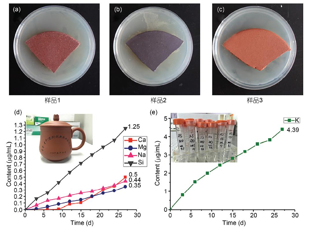 图1 实验所测试的紫砂陶片样品。(a)~(c) 3种样品分别为不同紫砂陶原料制成的前体;(d) 钠、镁、钙、硅含量的时间变化曲线,左上小图为实验所用紫砂茶杯;(e)钾元素含量的时间变化曲线,左上小图为实验样本