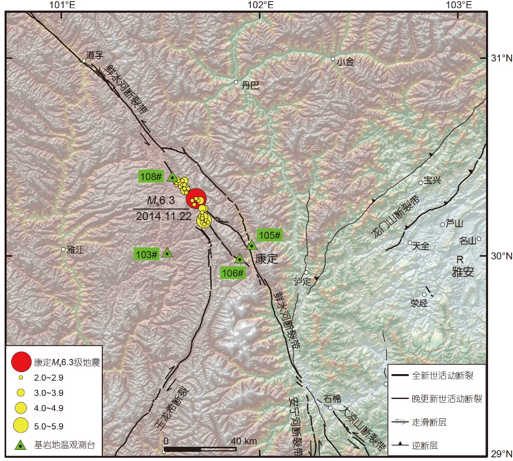 图1 基岩温度观测台站与康定地震 103#,105#,106#和108#为温度台站