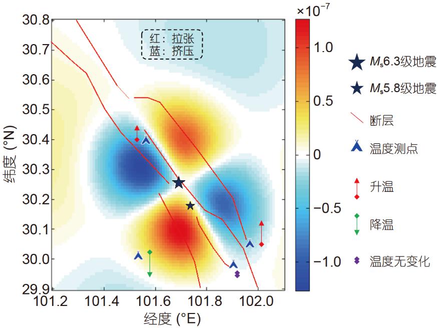 图2 康定 M s6.3 级 地震同震体应变分布与温度响应