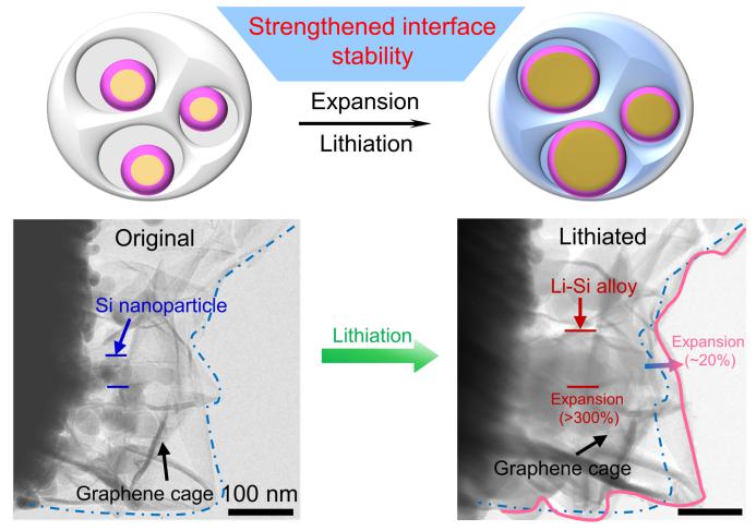 近年来,天津大学杨全红教授研究组发明了精确可控的毛细蒸发技术,巧妙地实现了碳网络的收放自如[4,5],并系统提出了构建高体积性能储能(致密储能)器件的设计原则、方法、材料、电极、器件的全链条解决方案[6,7],在超级电容器[8]、锂离子电池[9]、锂硫电池[10]、锂空气电池[11]、钠离子电池[12]、钾离子电池[13]等体系实现了高体积容量储能材料、电极、器件的构建,有力推动了基于碳纳米材料的新型电化学储能器件的实用化进程。特别是,杨全红研究组[14]最近在“厚密”硅基负极的构建中提出了一种通过可控收缩结合碳/硅界面修饰实现碳结构的力学缓冲增强策略,实现了“厚密”电极的高体积比容量(>1000 mAh cm–3)、高面容量(>6 mAh cm–2)和优异的体积、结构稳定性。在材料设计与制备方面,他们提出了可流动、可变形、可去除的“变形金刚”硫模板法,结合三维石墨烯网络毛细收缩技术,为硅纳米颗粒定制了碳笼结构,预留了必要的最小孔隙,并辅以聚多巴胺表面修饰增强硅纳米颗粒与石墨烯笼之间的界面结合力,实现了碳笼对硅纳米颗粒(硅含量>50%,重量百分比)的强限域,显著提高了硅-碳电极的力学缓冲能力。在电极密度为1 g cm–3、实用化面容量为3 mAh cm–2的条件下,该硅-碳负极的体积比容量超过1200 mAh cm–3(商用石墨负极的3倍以上)。循环100周之后,仍具有76%的容量保持率。当电极负载量增加到6。7 mg cm–2时,体积比容量为1015 mAh cm–3,稳定循环50周之后容量保持率在60%以上。同时,他们采用原位透射电子显微镜技术对膨胀负极进行了系统的力学增强解析,在碳笼的平面压缩测试中发现石墨烯笼在压缩反弹过程中(形变超过80%)对其中的硅纳米颗粒具有良好的限域效果; 而在垂直面剪切测试中则发现石墨烯笼在被剪切破坏的过程中,与限域其中的硅纳米颗粒仍保持很好的界面结合。基于原位透射电子显微镜的力学-电化学耦合表征证明,石墨烯笼具有足够的机械柔性和力学强度,对嵌锂后完全膨胀(>300%)的硅具有优异的限域缓冲效果(完全嵌锂时材料形变<20%),保持了硅-碳复合负极的体积稳定性和结构完整性。