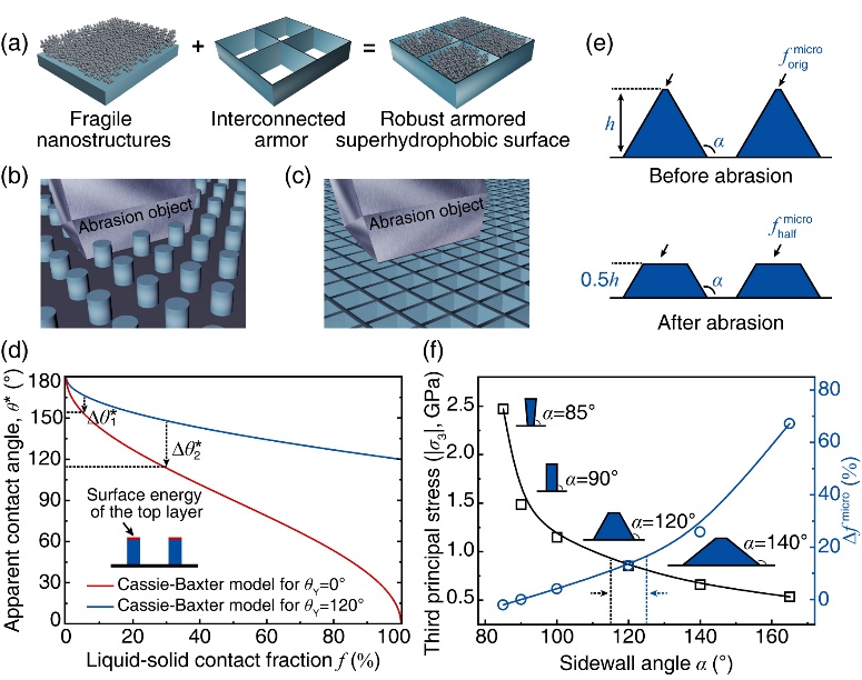 通常情况下, 微观结构的力学稳定性受其几何形状影响, 增加侧壁角度a 是提高结构稳定性的有效方法。为了验证这一原理, 我们通过有限元建模分析了不同侧壁角度微结构的稳定性, 证实了微观结构的稳定性随a的增大而显著提高(图1(f))。相反, 若磨损使微结构发生断裂性损坏, 假设高度被磨损至1/2时, 微结构的固-液接触分数变化量(Df micro)随着a的增大而增加(图1(f)), 即a越大, 磨损引起的超疏水性减弱越明显。在a » 120°时, 超疏水性和机械稳定性可实现较好的平衡。因此, “铠甲”策略的第二、第三个设计原则是保证微结构具有低的f micro和约为120°的侧壁角度。