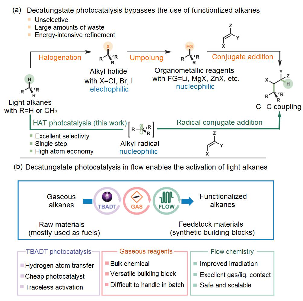 该工作选用了较为廉价的钨氧酸盐作为光催化剂, 实现了在温和反应条件下低碳烷烃C(sp3)−H键的直接活化, 有效简化了低碳烷烃活化的反应路径, 减少了能源消耗, 避免了有毒有害物质的使用, 为低碳烷烃绿色高效地制备高附加值化学品提供了新思路, 具有十分重要的理论研究意义和潜在的经济价值。