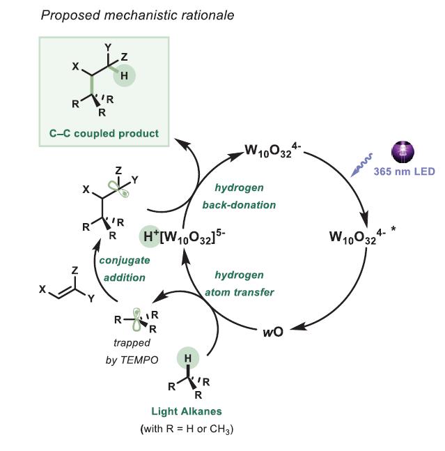 进一步地, 他们推测了TBADT光催化活化低碳烷烃C(sp3)−H键及Michael加成反应的机理(图2)。在紫外光照射下, [W10O32]4−生成激发态[W10O32]4−*, 迅速弛豫到反应态wO[11]。wO捕获低碳烷烃中的氢原子, 通过HAT过程将烷烃转化为所需的烷基自由基, 同时光催化剂转化为H+[W10O32]5−。随后, 烷基自由基与烯烃发生共轭加成反应, 产生烯烃烷基化自由基, 并从H+[W10O32]5−中夺回H(hydrogen back-donation), 生成目标产物, 而H+[W10O32]5−又重新回到了[W10O32]4−状态, 实现催化循环。