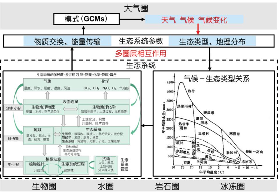在这篇评述文章中,作者厘清了生态气象的内涵与外延,阐述了生态气象的主要研究内容,并提出了生态气象的整体范式。这个范式既体现了以生态系统为核心的地球系统多圈层相互作用,也反映了天气、气候和气候变化对生态系统类型及其多尺度生物-物理-化学-管理过程的影响。