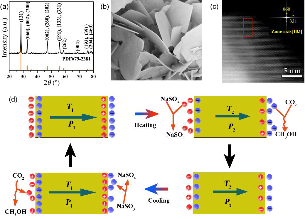 图1 (网络版彩色)钨酸铋的结构表征:(a) XRD,(b) SEM图片,(c) 原子分辨HAADF-STEM图。(d) 热释电催化还原二氧化碳为甲醇机理示意图[8]