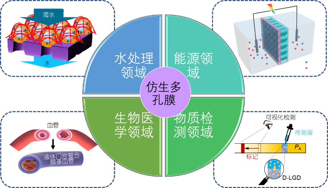 近些年来,仿生多孔膜材料在水处理、能源、生物医学、物质检测等领域得到了广泛应用(如下图所示)。