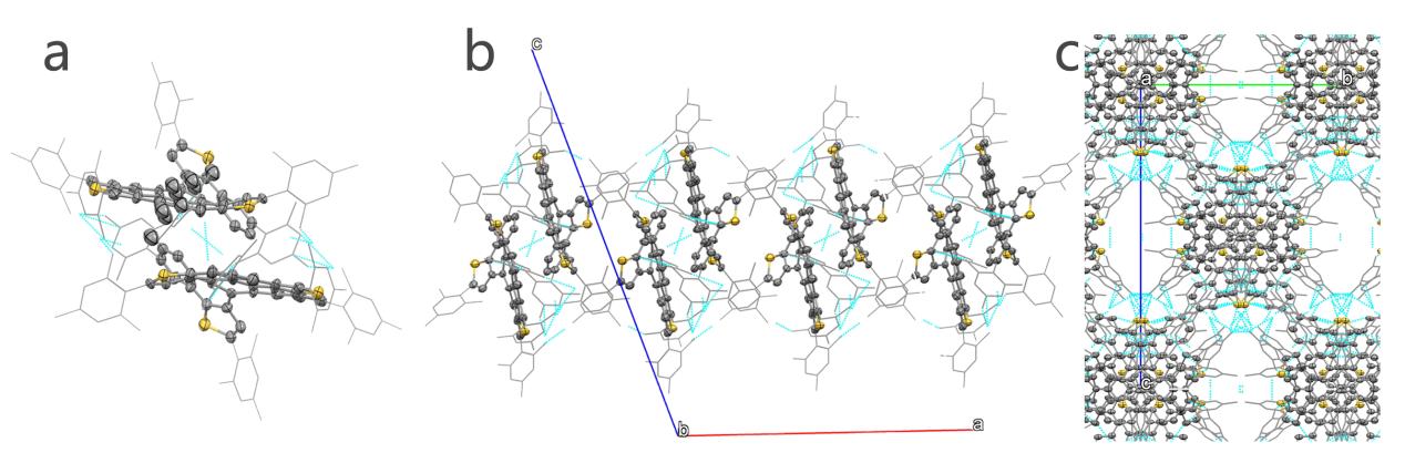 三重硫杂多环芳烃分子的晶体堆积结构. (a) 二聚体的结构; (b) 一维柱状堆积结构; (c) 010晶面堆积结构。天蓝色虚线表示分子间弱作用