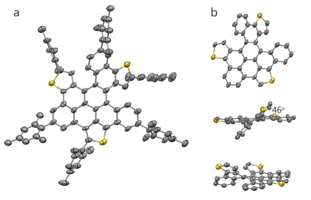 三重硫杂多环芳烃分子的晶体结构. (a) 分子的结构俯视图;(b)分子共轭碳骨架内核的结构俯视图及侧视图