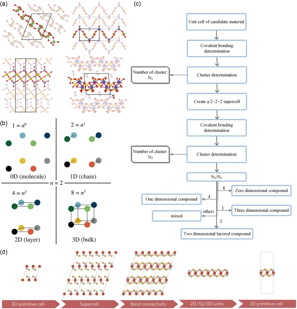为了从三维体相结构中找出能形成层状结构的材料,研究人员做出了许多努力。2012年,Björkman等人提出,可以通过几何条件从ICSD数据库中筛选出范德华力结合的层状结构,过滤掉晶体填充率较低的体系,再筛出具有大间隙的化合物,最终筛选出四方和六方体系。