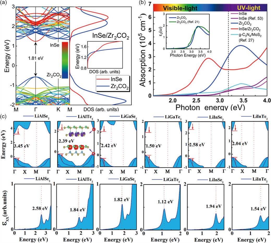 此外,对于光催化剂,应该尽可能地提高其利用可见光的能力,因为可见光占太阳能的40%以上,而紫外光则占不到5%。如下图(c)所示,Xu等人基于G0W0方法和G0W0-BSE方法预测了二维光催化剂的能带结构和光谱。它们中大多数都覆盖了可见光范围,具有捕获光谱中可见光部分的能力。