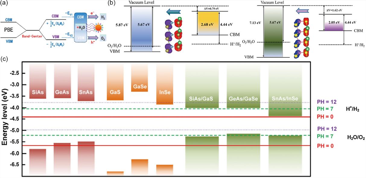 光催化水分解反应对催化剂的带边位置有着严格的要求,即CBM和VBM必须同时高于水的还原电位(–4.44 eV,相对于真空能级)并低于水的氧化电位(–5.67 eV,相对于真空能级),下图c展示了不同pH下水的氧化还原电位,以及相应2D材料的带边位置。本文介绍了G0W0结合传统PBE泛函计算得到校正带边位置的方法,如下图a所示。