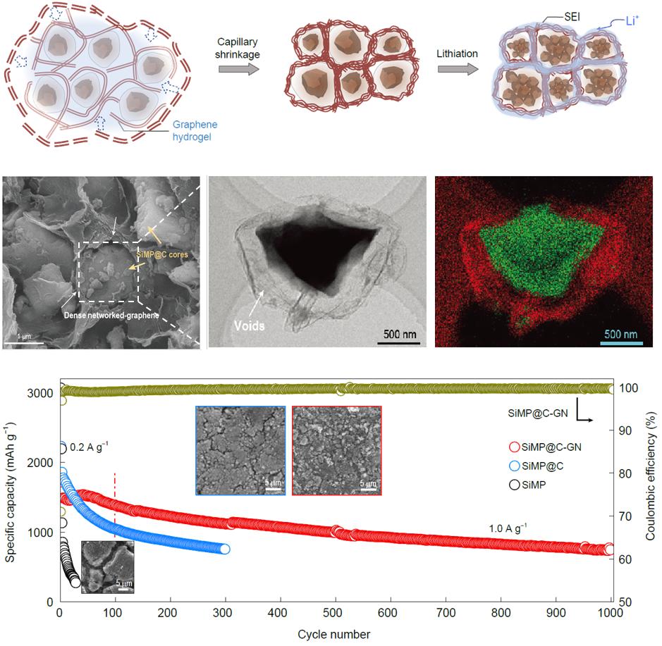 如上图所示,研究者首先通过化学气相沉积方法,在微米硅表面制备出一层连续的超薄碳层,通过处理,在碳壳与内部微米硅之间可以产生一定的孔隙。然后,在水脱出产生的毛细收缩力作用下,石墨烯片层高度交联并紧密黏附在得到的碳壳表面,形成致密收缩的“金刚软甲”结构,实现了应力释放、电子传输网络和表面保护层功能的一体化。