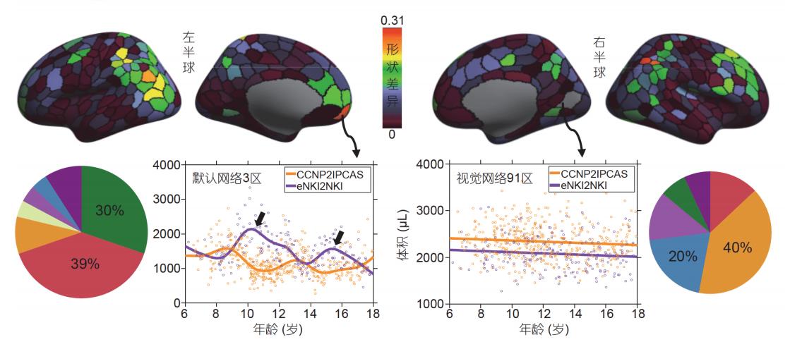 中美青少年脑区分布及脑网络形态发育曲线