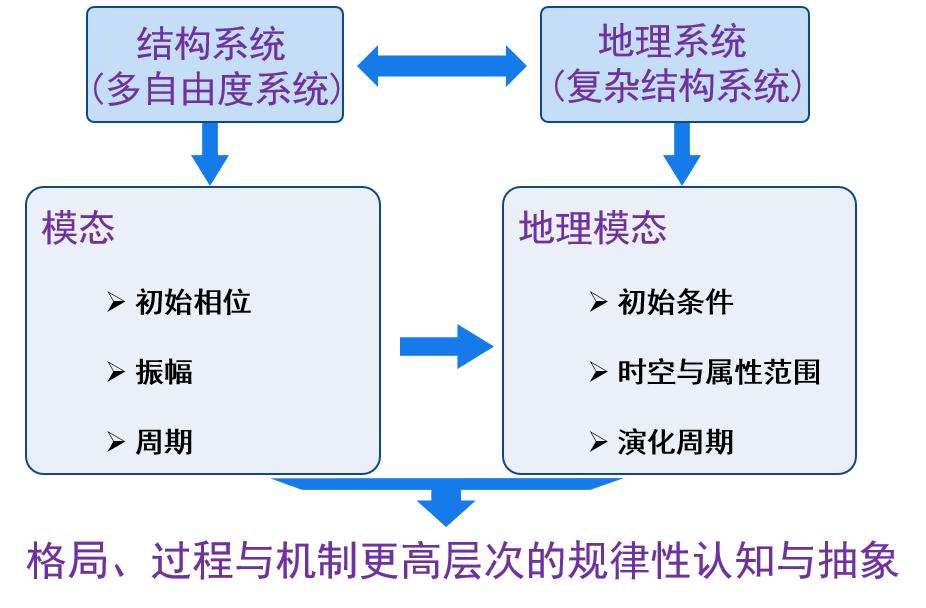 本文尝试基于地理模态的地理综合方法论进行思考。事实上,溯源地理研究的本质,不管依据哪种研究范式,都是对地理系统固有规律的探索。尽管不同学科研究者对地理系统开展了纷繁多样的研究工作,但其本质性指导都是建立在物质守恒、能量守恒、质量守恒等基础物理规律之上的。地表空间的水热条件和固体地球的运动特征在整体上主导了地理系统的时空格局,自然地理学中经典的“地域分异-区域等级-地段类型”研究体系事实上也是将地理系统作为结构系统看待。因此,整个地理系统与一般结构化的物理系统相当。对一个结构系统而言,模态分析是获取整体特征和开展综合研究的重要手段。