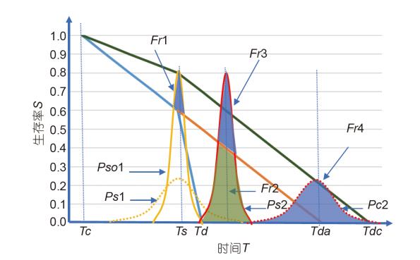 之后,作者将空间维度纳入考量,讨论了“二维优化”。如下图所示,对现场急救资源到达时间、救护车到达时间,以及患者从出现胸痛到决定寻求医疗帮助的延迟时间的概率分布曲线(分别为Ps1、Ps2和Pc1)进行优化,可以拓宽生存率提高的可行域(图中的Fr1、Fr2、Fr3和Fr4区域),提高患者的生存希望。而且,这些环节是环环相扣的,例如,只有在及时开展现场急救的前提下,患者才能在救护车到达时保持存活状态,获得后续的院内治疗机会。