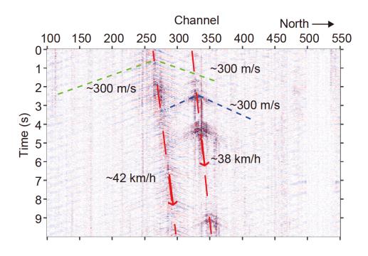 2018年12月30日下午15时12分通信光缆(道号100~550,主要位于太和路)观测到两组强振动信号(红色虚线表示),分别对应了以约42和38 km/h速度向北移动的信号(红色箭头所示)。同时移动源也激发了以~300 m/s(绿色及蓝色虚线)向两侧传播的信号,信号的传播速度与地表的面波速度接近。