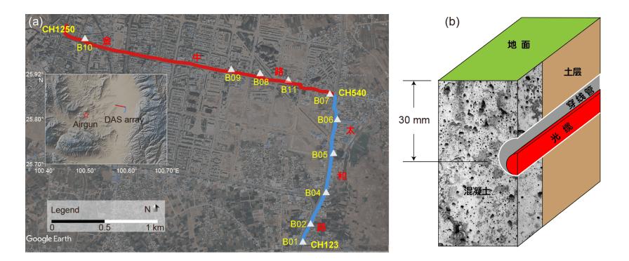 (a) 通信光缆分布(红色和蓝色粗线),黄色数字表示道号。插图显示了气枪震源(红色五角星)和光缆(DAS array)的相对位置。白色三角形为短周期地震仪。(b) 通信光缆布设示意图。光缆(红色)松散地穿过穿线管(灰色),穿线管埋于土中,在检修口处穿线管由混凝土浇筑。