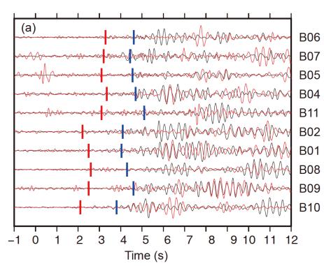 红色和黑色曲线分别为DAS和短周期地震仪记录的气枪震源信号(2~8 Hz)。拾取的到时与由区域速度结构模型计算的上地壳折射Pg(红色竖线)和Sg(蓝色竖线)的到时吻合