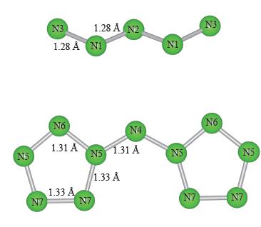 l 氮链包含3种不等价原子(下图中N1、N2、N3),呈“W”型链。其中氮氮键长约为1.28 Å,大于氮氮双键键长,但小于氮氮单键键长。