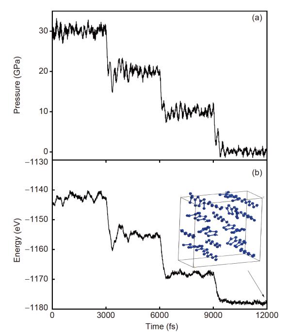 分子动力学模拟Cm结构的压强(a)和总势能(b)随时间的变化