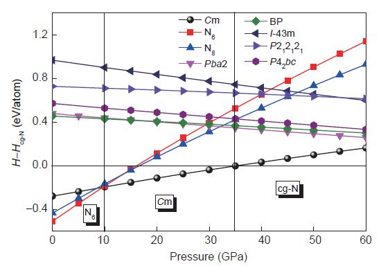 为了确定该结构的稳定区间,作者计算了T=0 K时0~60 GPa压强范围内不同聚合氮结构的焓值与压强的函数关系。结果显示,Cm聚合氮在10~35 GPa压强范围内焓值最低。