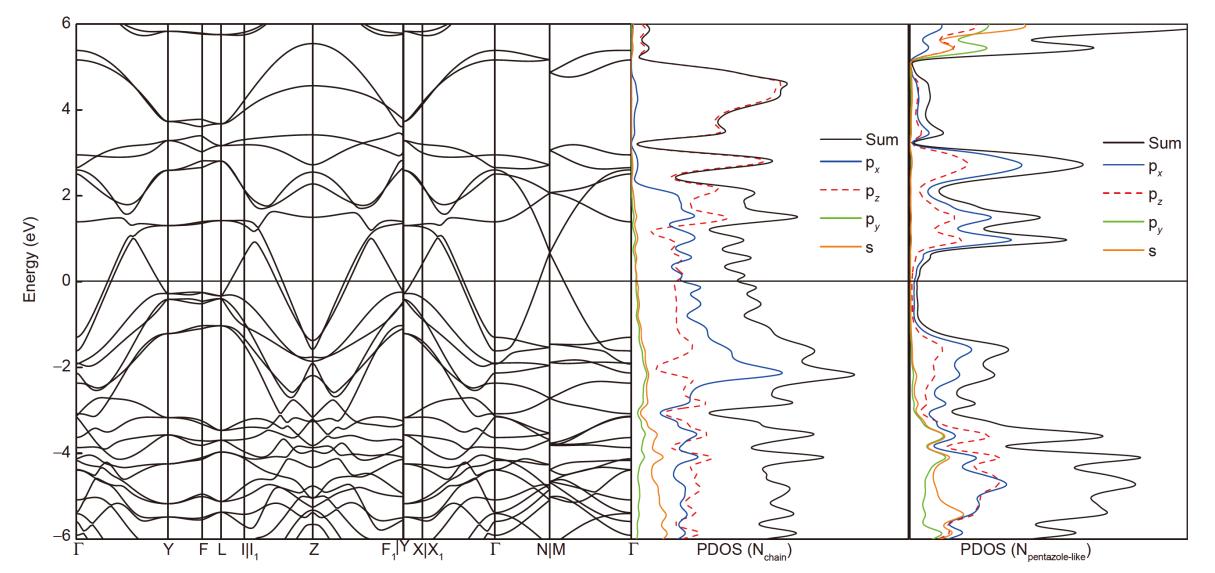 Cm结构在30 GPa时的电子结构性质。(a) 能带结构; 氮链(b)和类连五唑(c)的分波态密度图