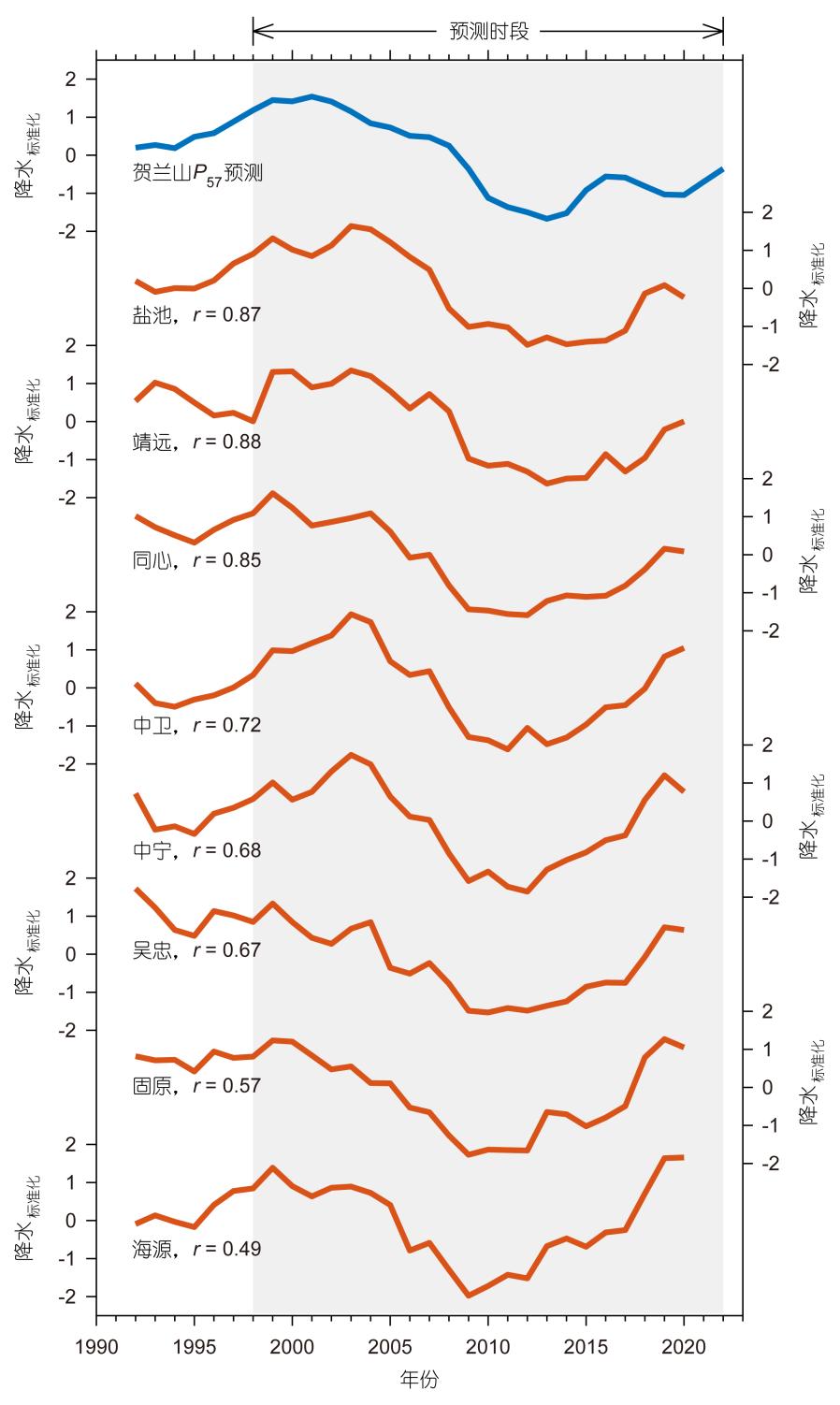 后来,这一预测结果得到了贺兰山周边数个气象站观测数据的支持和验证。预测结果与20多年来的气象观测记录相当吻合(见下图)。刘禹研究员在《科学通报》2021年第26期上以“以树轮资料进行年代际气候预测实例评估”为题,展示了这一分析结果。