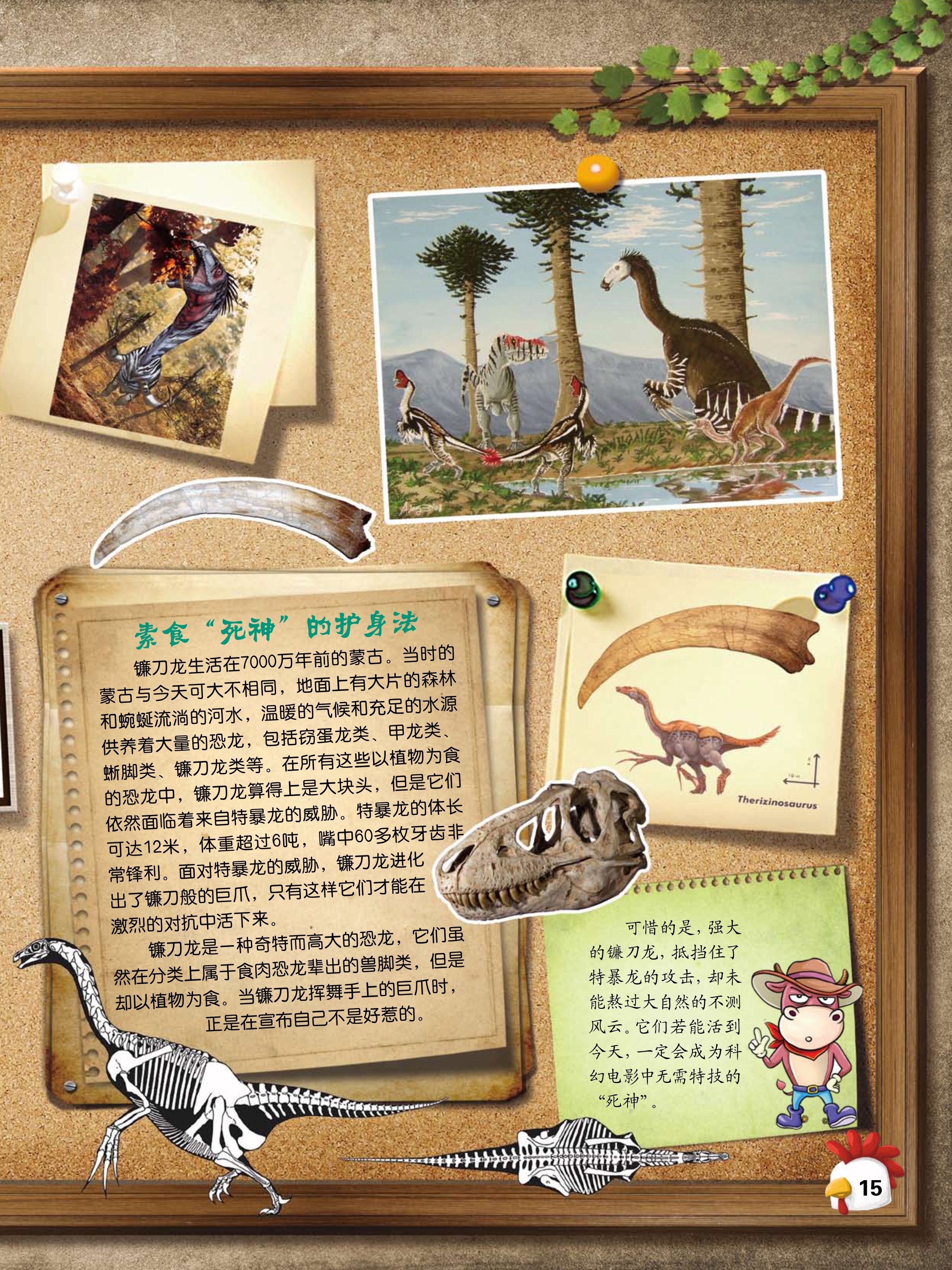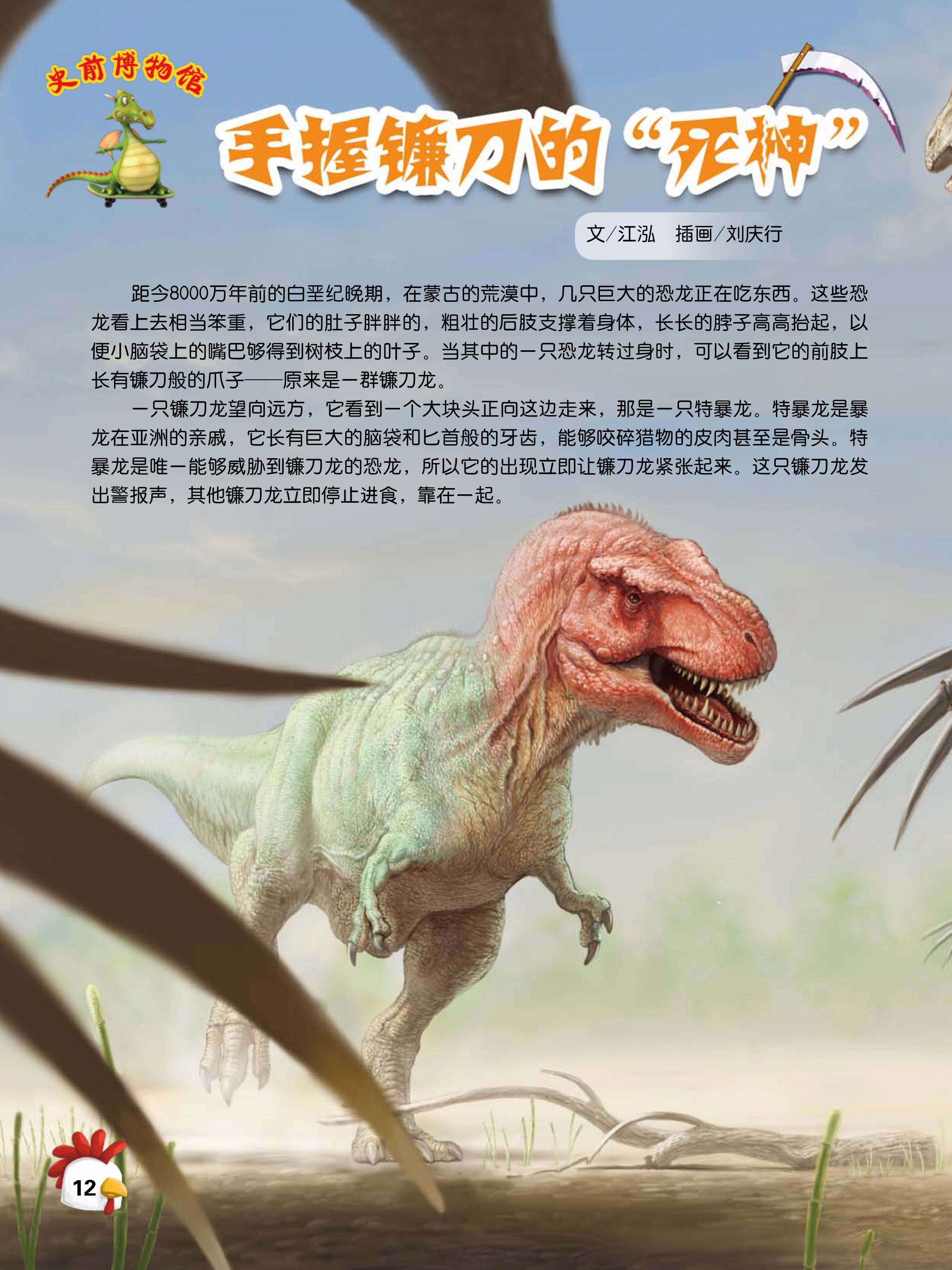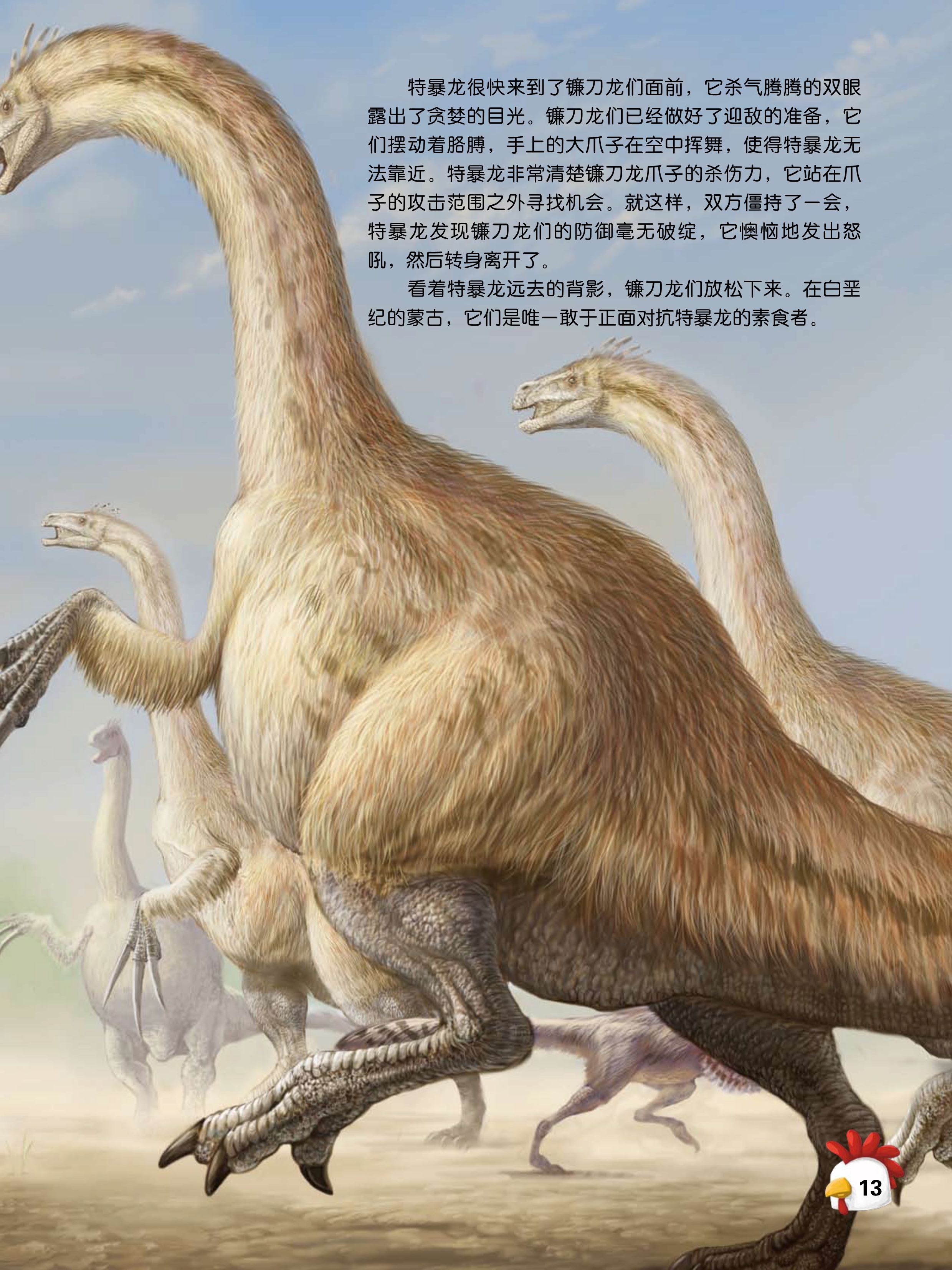距今8000万年前的白垩纪晚期,在蒙古的荒漠中,几只巨大的恐龙正在吃东西。这些恐龙看上去相当笨重,它们的肚子胖胖的,粗壮的后肢支撑着身体,长长的脖子高高抬起,以便小脑袋上的嘴巴够得到树枝上的叶子。当其中的一只恐龙转过身时,可以看到它的前肢上长有镰刀般的爪子——原来是一群镰刀龙。