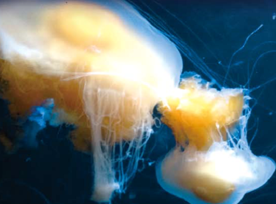 煎蛋水母其实比我们平常吃的煎蛋大多了。大部分水母都由3个主要部分组成:圆伞状或钟状的身体(我们称之为伞状体)、触手和口腕。煎蛋水母的伞状体直径可以达到0.6米,触手可以达到6米长。之所以被称为“煎蛋”,是因为在它们的伞状体中,白色的性腺组织包围着中央的黄色物质,看起来就像半熟的荷包蛋一样诱人。与大多数水母不同,煎蛋水母能通过摆动“蛋清”来移动身体,而不仅仅是随波逐流。