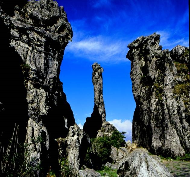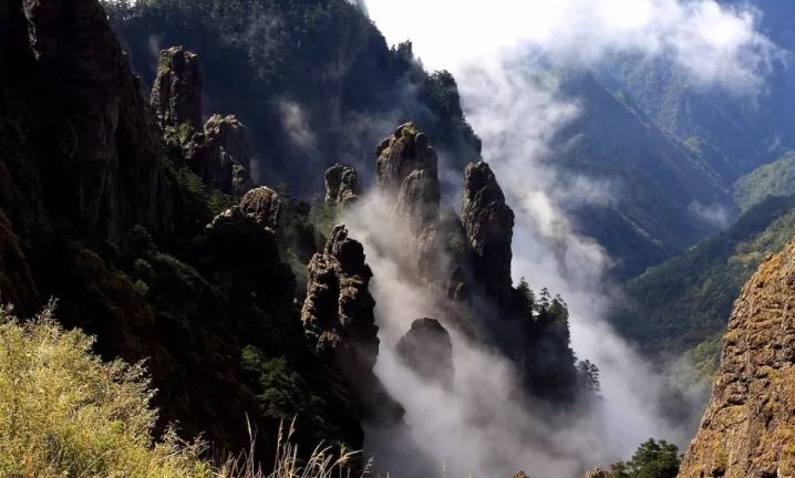 在海拔2590米的板壁岩,除了分布着高山草地、箭竹群落、高山杜鹃、原始森林等景观,还矗立着形态各异的石林。这里汇集了神农架最密集的白云岩石芽群,由此构成石芽、高山草甸、巴杉冷杉和箭竹林自然景观。这里还是传说中“野人”栖身地之一。在这一带,历史上多次发现“野人”出没的痕迹,竹林中经常能发现野人的足迹、毛发、粪便和用箭竹做的窝。