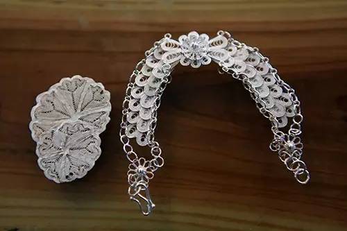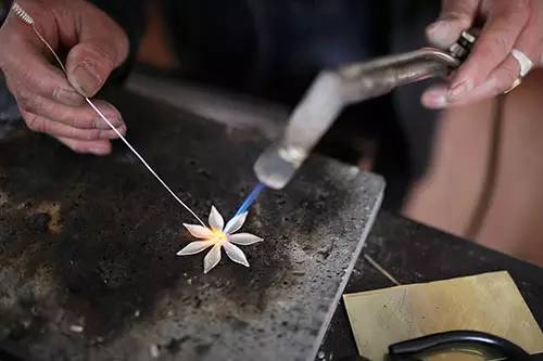 徒弟们最重要的一课是银饰焊接。一套银饰是由许多“零件”组合起来的,组合方法主要就是焊接。银线和银线间、银线和骨架间,都可以焊接。一切依靠经验,没有明确的温度和时间作为依据,全凭感觉。温度不够,便焊接不牢固。过火了,就熔化过度,线条变糊了,那就白忙一场了。