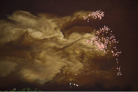 数量众多的火烈鸟散落在水面上,有的低头觅食,有的闭眼小憩,有的三三两两交头接耳,有的沉醉在自己的舞步中,有的则列队展翅飞翔……就好像成千的火苗撒落在湖面上,随着温和的春风而舞动。