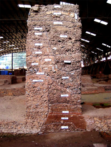 ↑南越国宫署遗址中的考古关键柱,标识了13个历史时期的地层叠压。
