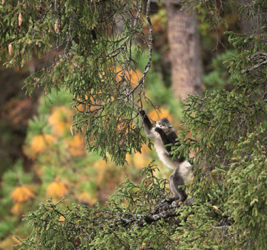↑冷杉给滇金丝猴提供食物和隐蔽所,滇金丝猴为冷杉清除“吸血鬼”。松萝是滇金丝猴的主要食物,图中这只母猴正在采食一种更好吃的黑色松萝。