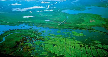 ↑俯瞰鄱阳湖湿地。作为全球最重要的淡水 湖泊湿地之一,这里以丰富的生物