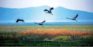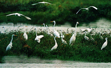 丰富的动植物资源为水鸟提供了丰富的食物,因而这里成为了鸟类的天堂。每年10月至次年3月,在这儿可见万鸟翔集、百鸟争鸣,鸟儿或嬉戏、或觅食、或翱翔,千姿百态的万鸟图会让你流连忘返,陶醉其中。