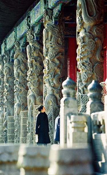 ↑孔庙大成殿龙柱。大成殿四周廊下环立着28根雕龙石柱,均以整石刻成,每柱上刻有72条龙,且各具变化,无一雷同。