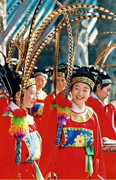 ↑曲阜祭孔大典。祭孔大典是专门祭祀孔子的大型庙堂乐舞活动,是集乐、歌、舞、礼为一体的综合性艺术表演形式。