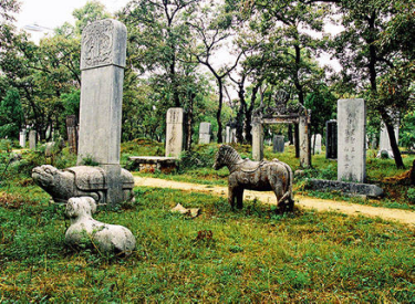 ↑孔林明朝墓群。孔林中墓冢累累,碑碣林立。其中有许多是历代大书法家的亲笔题碑,故而孔林又有碑林的美名。