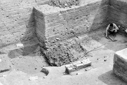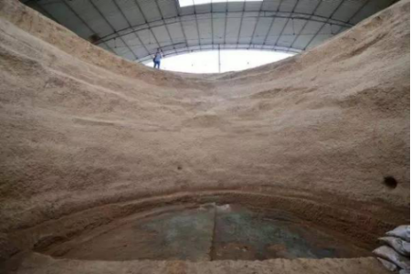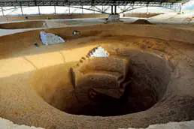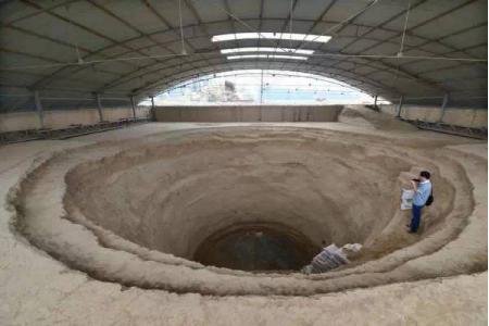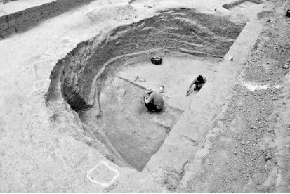 ↑洛阳回洛仓遗址发掘出巨大的圆缸形粮窖。