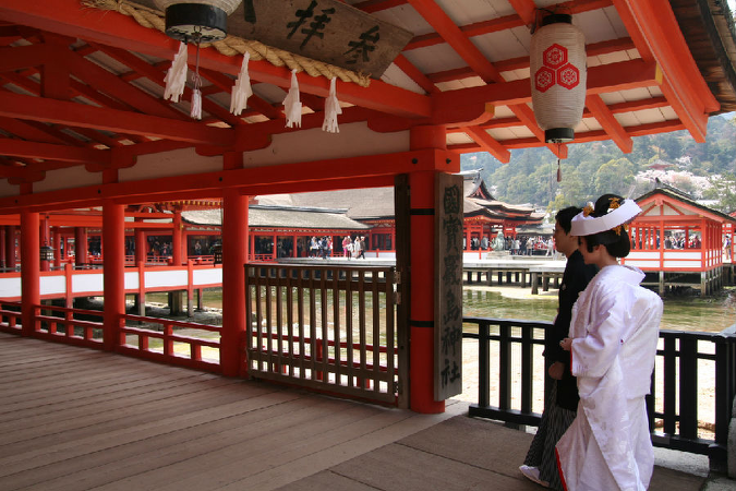 神社是日本人的精神图腾。从寝殿的庄严华丽的建筑风格上,就可以看出日本人对这里的厚爱与重视。听导游介绍:神殿已列为国宝,大部分建于12世纪,以总神社为中心,周围建造了21栋建筑物。各种建筑物以一条近300米的朱红色回廊作为连接通道,将正殿围在当中,每一段间隔,必定搭配雕梁画柱,非一般地华丽而优雅,回廊尽处设有宝物馆,展出“平家纳经”等国宝文物。