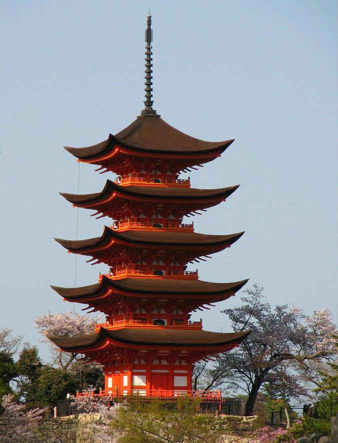 从千叠阁出来,神社左侧的山岗上有建于应永十四年(公元1470年)大愿寺的五重塔,一眼就看出建筑风格十足地混搭,唐朝式样和日本式样相结合,高度为27.6米的塔身很明显是个唯美建筑,以前内部供奉着佛像,明亮的朱红色和俏丽的姿影,在这宫岛上也算是一个值得记忆的去处了。