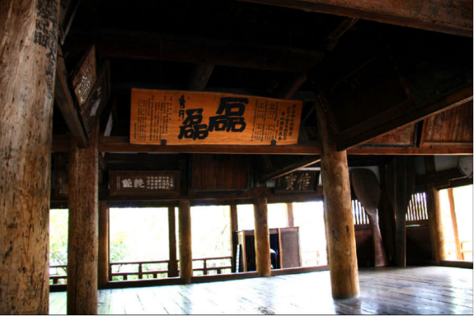 进口处,按照要求,我脱掉鞋子。踏上木制的台阶,眼前展现出一个四面通透的超大的空间来。几大排伫立的木柱支撑起这个全木制结构,屋顶的建筑结构全部由木材搭建,细密地木条编织,仿似蜂巢,最醒目的是那些挂在大木掾子上日本不同时代奉纳的画像和书法,虽然有些已经模糊不清,而大大的“磊”字和“肃静”,是这里最该保有的一种心绪。